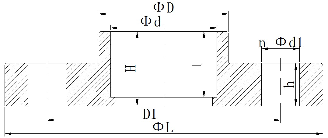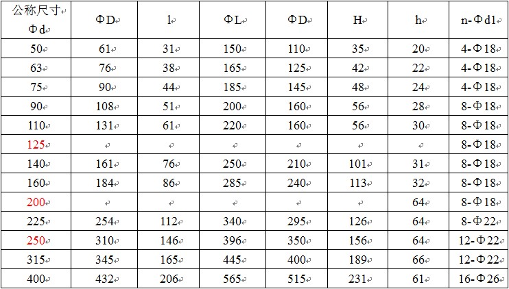 其中“ΦD”表示法兰根外径,“Φd”表示法兰根内径,“ΦL”法兰盘直径,“D1”表示法兰盘对角螺栓孔距离,“H”表示法兰根承口长度,1.0MPa=10公斤
