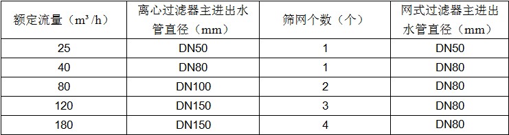 其中“直径DN50mm”表示离心过滤器主进出水管直径50mm,“流量50m3/h”表示离心过滤器额定流量50m3h。