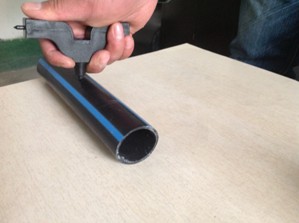 1. 将打孔器钉头垂直于PE管,手紧握住打孔器柄,下压。