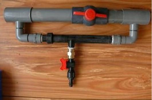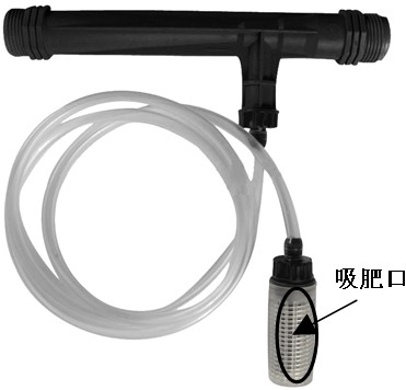 文丘里施肥器需要与灌溉系统供水管路控制阀并联使用,使用时将控制阀门关小,造成控制阀门前后有一定的压差,使水流经过安装文丘里施肥器的支管,利用水流通过文丘里管产生的真空吸力,将肥料溶液从敞口的肥料桶中均匀吸入管道系统进行施肥。